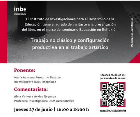 No te pierdas la presentación del libro en el marco del seminario #EducaciónEnReflexión: ‘Trabajo no clásico y configuración productiva en el trabajo artístico’, por María Azucena Feregrino, de la UAM Iztapalapa. Conéctate el 27 de junio, 16:0o hrs.